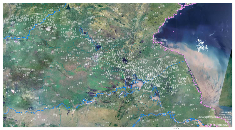 MICAPS4.0中的黃淮地區1小時降水自動站數據和地形疊加圖。高嵩供圖