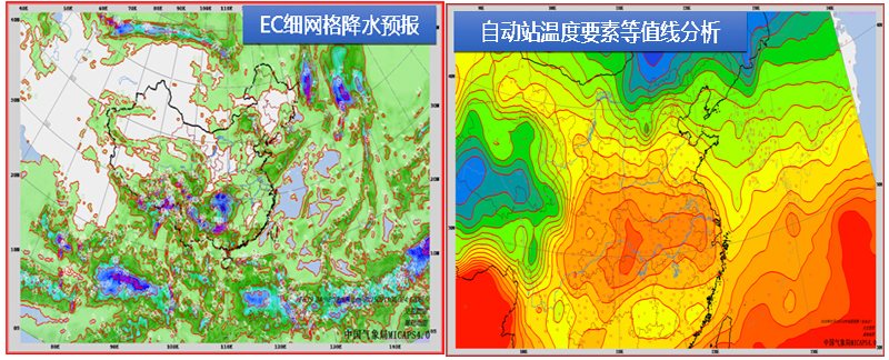 MICAPS4.0中的細網格降水預報圖(左),自動站溫度等值線分析圖(右)。高嵩供圖