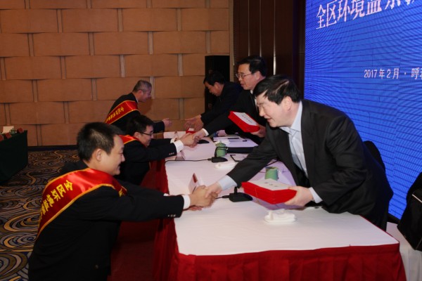 會議上,自治區環保廳依據環境行政處罰案件數及罰款金額、執行環保法及四個配套辦法等環境監察執法重點工作完成情況,對66名全區環境監察執法工作先進個人進行了表彰。為確保完成2017年全區環境監察執法重點工作任務,自治區環境監察局就8個方面的重點工作,與各盟市環境監察支隊簽訂了《2017年環境監察執法重點工作責任狀》,并就進一步強化工作措施進行了座談討論。