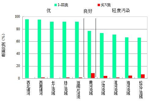 2021年1月,長江、黃河、珠江、松花江、淮河、海河、遼河等七大流域及西北諸河、西南諸河和浙閩片河流水質優良(Ⅰ~Ⅲ類)斷面比例為84.5%,同比上升5.0個百分點;劣Ⅴ類斷面比例為2.4%,同比下降2.1個百分點。主要污染指標為化學需氧量、氨氮和高錳酸鹽指數。其中,西北諸河、西南諸河、長江流域、珠江流域和浙閩片河流水質為優,黃河流域水質良好,遼河、淮河、海河和松花江流域為輕度污染。