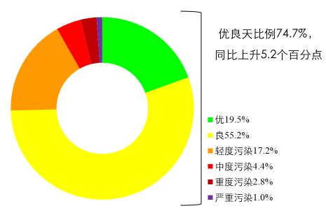 2021年1月,全國339個地級及以上城市平均優良天數比例為74.7%,同比上升5.2個百分點;PM2.5濃度為54微克/立方米,同比下降15.6%;PM10濃度為89微克/立方米,同比上升8.5%;O3濃度為85微克/立方米,同比下降3.4%;SO2濃度為14微克/立方米,同比持平;NO2濃度為36微克/立方米,同比上升16.1%;CO濃度為1.5毫克/立方米,同比下降6.2%。