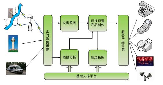 從總體上看,山洪地質災害監測預警業務可以分為數據采集、預報預警、災害監測、預報預警產品制作、服務產品分發五個環節。在重大災害出現時,氣象部門還要承擔起部分應急指揮的職能。總體業務流程如下圖所示: